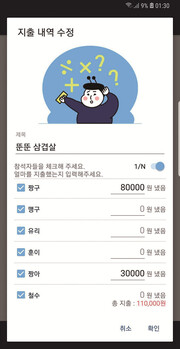 N차 회식을 이어가는 동안 참여 인원도, 결제한 사람도 뒤죽박죽일 때 머리 아프게 고민할 것 없이 더치페이 앱을 사용해 보자. 지출 합계는 물론 누가 누구에게 얼마를 보내야 할지도 간단하게 계산해 준다. 정산 내역은 메신저나 문자 등으로 손쉽게 공유 가능하다.