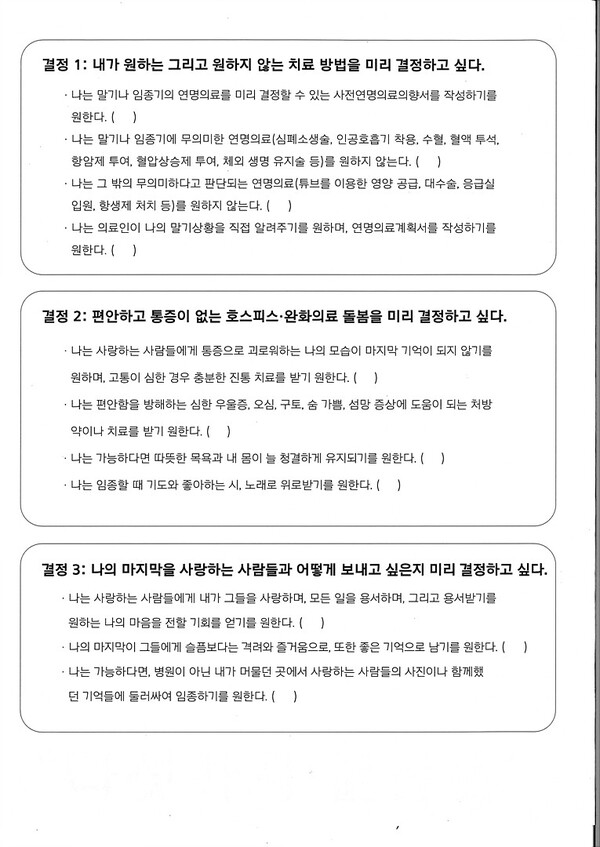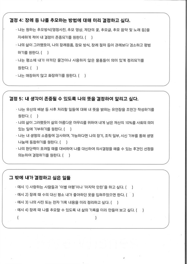 삶을 마무리하면서 결정해야 할 일에 대한 일종의 가이드라인이다. 가족, 사랑하는 사람들과 긴 이별 앞에서 내가 무엇을 원하는지 막연하게 추측하지 않도록 웰다잉 문화 운동에서 세부 사항을 대신 정리해 알려주는 것이다.