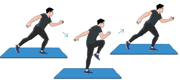 ➋ 앞쪽 다리를 바닥에 고정하고 뒤쪽 다리를 앞으로 빠르게 옮기면서 무릎을 굽힌다. 무릎이 허리 높이까지 오면 멈춘다.