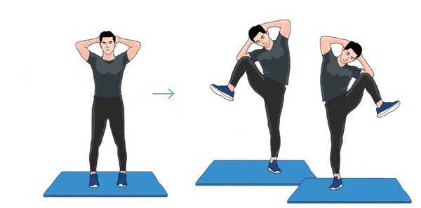 등부터 엉덩이까지 코어근육 전체를 단련하는 운동인 스탠딩 크로스 니업. 옆구리에 위치한 복사근 강화와 유산소운동에 좋다. 같은 쪽의 팔꿈치와 무릎이 서로 닿도록 하는 게 포인트다.