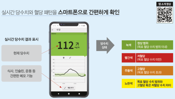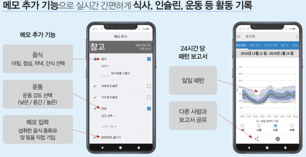 연속혈당측정기를 사용하면 사용자의 혈당 변화를 분 단위로 추적할 수 있다. 기존 측정 방식과는 비교할 수 없을 정도로 정확하고 풍부한 데이터를 확보할 수 있는 것. 이 데이터는 개인별 맞춤형 식단을 구성하거나 의료진이 정확한 처방을 내리는 근거 자료가 된다. 또 측정할 때마다 손가락을 찔러 피를 내야 하는 고통과 불편함이 사라져 생활의 질이 크게 향상된다. 혈당 상한치 및 하한치를 정해놓으면 저혈당이나 고혈당 상태가 될 경우 경고 알람이 울려 조기에 대처할 수 있다. 이를 통해 혈당 변동성 및 저혈당 발생 빈도를 획기적으로 낮출 수 있다. 실제로 2019년 미국당뇨병학회에서 발표한 ‘표준 당뇨병 진료’ 항목에는 ‘당뇨병 기술’이 새롭게 추가되면서, 제1형 당뇨병 환자의 경우 연속혈당측정(Continuous Glucose Monitoring, CGM)과 연동해 인슐린 펌프 치료를 시행함으로써 혈당을 조절하는 것이 근거 수준 A로 권고돼 있다.