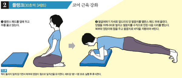 플랭크는 바른 자세를 유지할 수 있는 코어 근육을 강화해주는 운동이다. 혈당을 낮추는 데 매우 효과적이며, 당뇨병 환자의 합병증 예방에도 좋고, 복부비만 개선 효과도 볼 수 있는 운동이다. 다만 밸런스 패드 위에서 플랭크를 할 때 자세가 바르지 않으면 오히려 근골격계질환이 발생할 수 있어 주의가 필요하다.