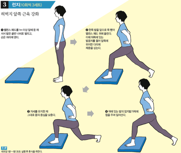스쿼트가 쉽다면 런지를 추가해 강도를 높인다. 런지는 스쿼트로 자극을 주기 쉽지 않은 엉덩이와 허벅지의 세부 근육을 사용해 골반 교정에도 도움이 되는 운동이다. 식사 전 후 꾸준히 하면 정상 혈당 수치를 유지하는 데 큰 도움이 된다. 밸런스 패드 위에서 하기는 조금 어렵고 힘든 운동이지만 본인 체력 수준에 맞게 한다면 혈당을 낮추고 유지할 수 있는 매우 효과적인 운동이다.