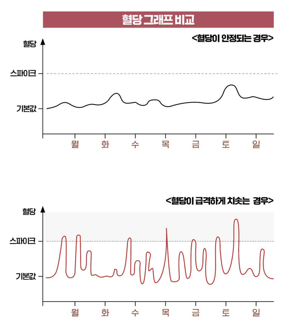 혈당 스파이크는 ‘파도’와 같다. 파도가 크게 치면 단단한 방파제도 무너지듯, 혈당이 큰 폭으로 요동치면 혈관이 버티지 못하고 문제가 생긴다. 혈당이 140 정도로 유지되는 사람과 110, 190을 오가는 사람의 평균 혈당은 비슷하다. 하지만 후자의 경우에는 몸 곳곳에 무리가 생길 수밖에 없다. 실제로 혈당 스파이크가 빈번하면 단기적으로는 여드름이나 수면 장애, 편두통 등을 일으키고, 장기적으로는 제2형 당뇨병, 심혈관질환, 치매, 관절염, 우울증, 불임 등을 초래할 가능성을 높인다.