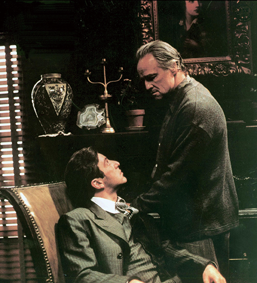 이탈리아 시칠리아섬 마피아를 모티브로 한 영화. 강한 카리스마로 조직원들에게 존경을 받는 대부 ‘돈 콜레오네’에게는 각종 청탁이 물밀듯 들어온다. 강한 권력을 지닌 대부는 상대방의 치부를 들춰내거나 살벌한 협박을 가해 원하는 것을 얻어낸다. “거절할 수 없는 제안을 하지”에서 거절은 곧 죽음을 의미한다. 돈 콜레오네를 연기한 말런 브랜도는 젠틀하지만 무게감 있는 연기로 모든 관객을 압도했다.