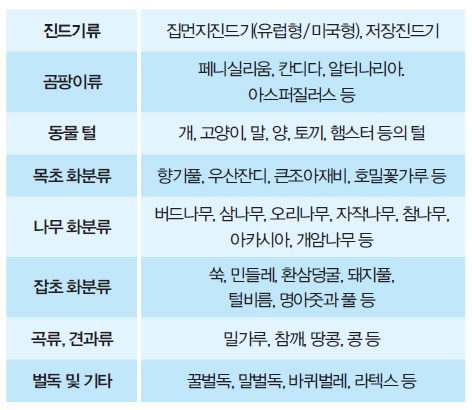 알레르기 검사의 종류 및 시행하는 기관에 따라 한 번에 확인하는 알레르기 항원의 종류와 개수가 다르다. 국내에서 시행하는 검사에서 흔하게 확인할 수 있는 알레르기 항원은 다음과 같다.