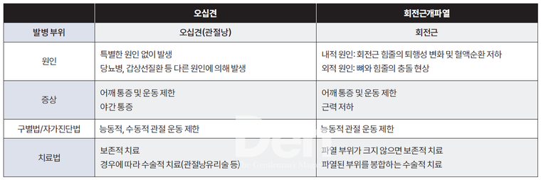 통증의 양상도 약간 차이를 보이는데, 오십견은 어깨를 움직일 때 심한 통증과 야간 통증을 유발하는 반면, 회전근개파열은 파열 정도에 따라 어깨 근력 저하가 나타난다는 점이 특징이다.