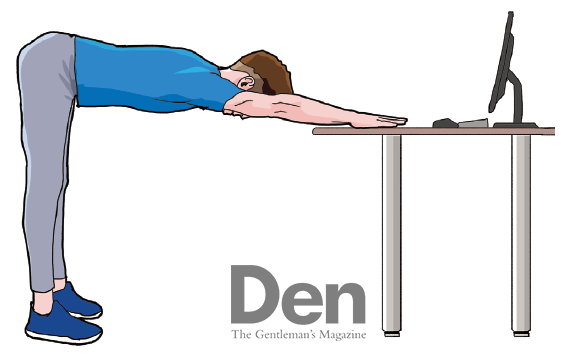 ➀ 책상 앞에 서서 한 발 뒤로 물러선 뒤 양발을 어깨너비로 벌린다.