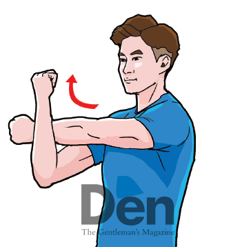 ➂ 가슴을 앞으로 내밀면서 어깨와 가슴을 펴며 근육이 늘어나는 것을 느낀다.