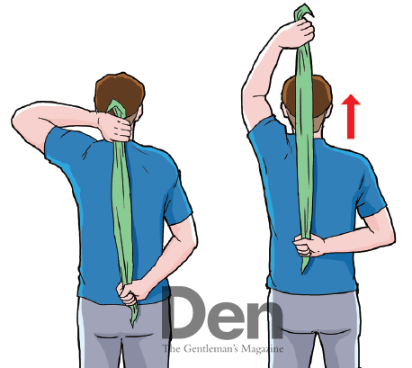 ➀ 등과 허리를 곧게 편 후 등 뒤에서 양팔로 수건의 양끝을 위아래로 잡는다.