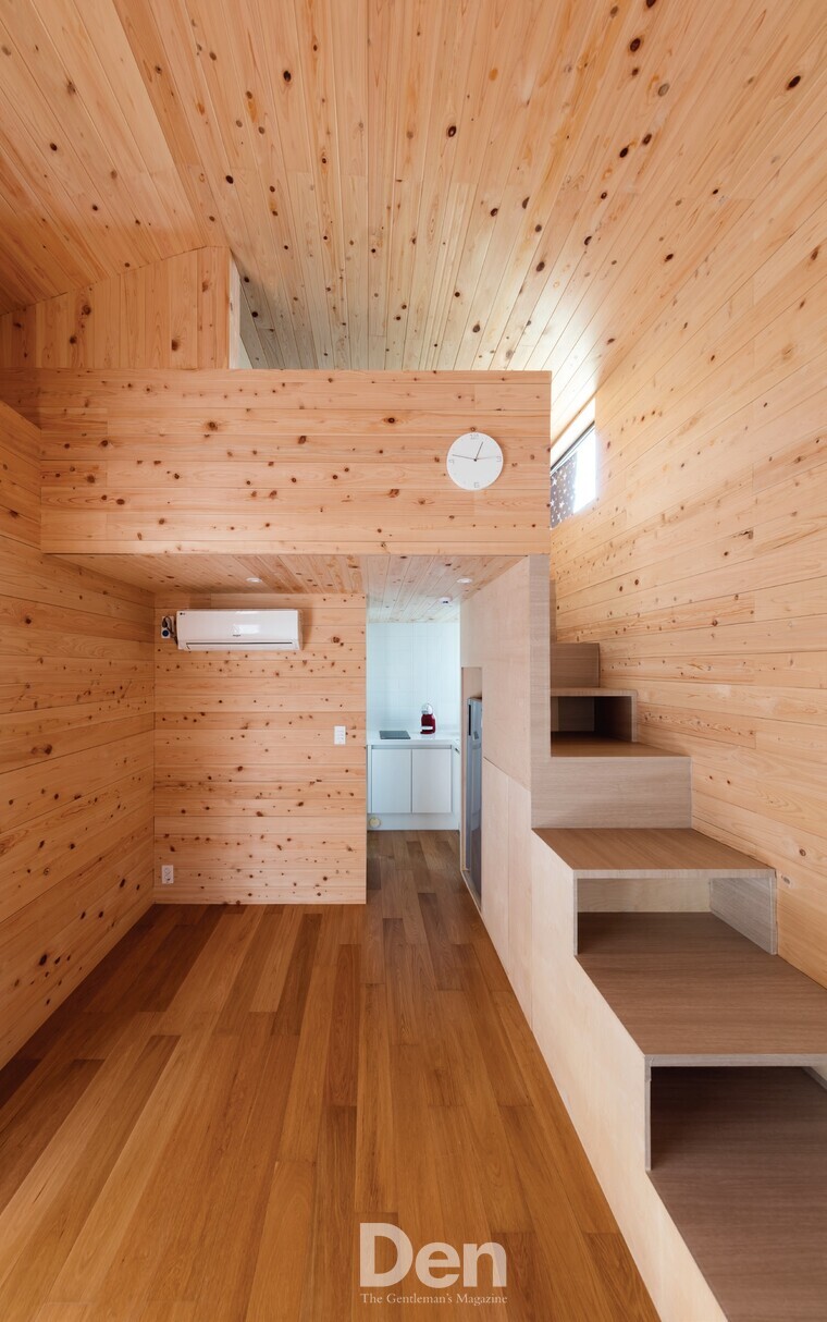 내부 공간은 복층으로 구분하고 계단 아래를 수납공간으로 활용했다. 1층에는 거실을 중심으로 주방과 화장실이 있다. 내장재로 사용한 편백나무는 이음새가 군더더기 없이 직각으로 떨어져 심플하면서도 고급스럽다. 작은 집에는 친환경 벽지나 패브릭을 많이 사용하지만, 건강하고 자연스러운 느낌을 주는 편백나무를 선택했다. 목재 특유의 수축·팽창하는 성질을 고려해 원목 사이에 조이너를 넣어 틈새가 보이지 않게 했다.