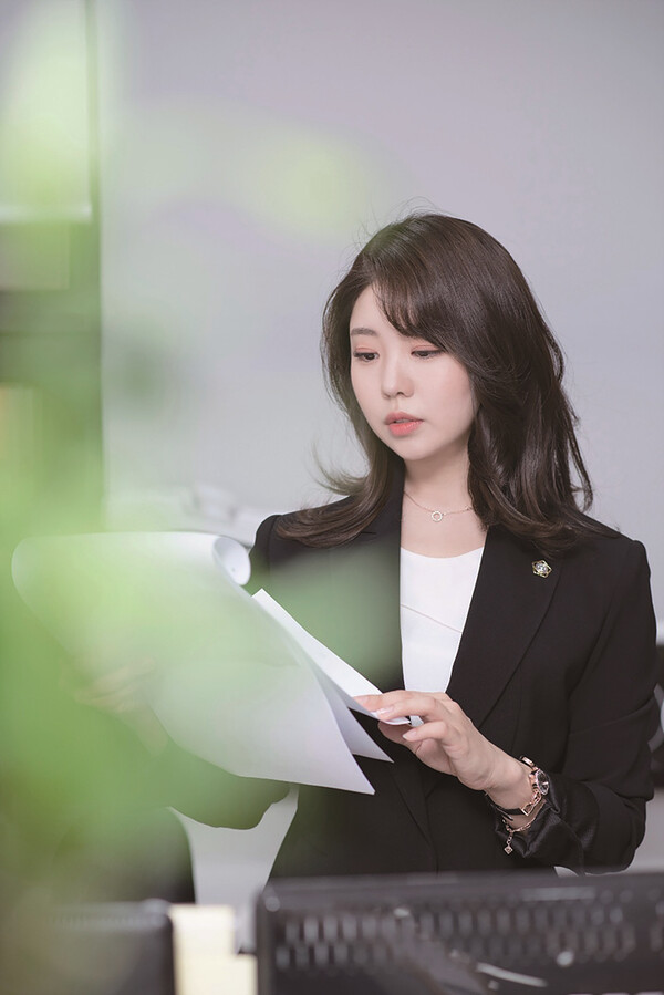 모델 활동을 하면서 많은 사진을 찍는다. 하지만 정작 본업인 변호사로서 모습을 담은 사진은 별로 없더라. 그래서 고민 끝에 검은 정장을 입었다. 평소 가장 많이 보는 내 모습인데 카메라에는 못 담아본 모습을 기록하고 싶었다. 머리를 묶고 촬영하는 것도 이번이 처음인 것 같다. 변호사로서는 익숙한 모습이지만 모델로서는 낯선, 몇 장 없는 내 모습을 기록하는 일도 의미 있다고 생각했다.