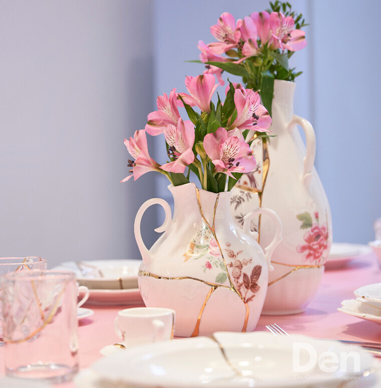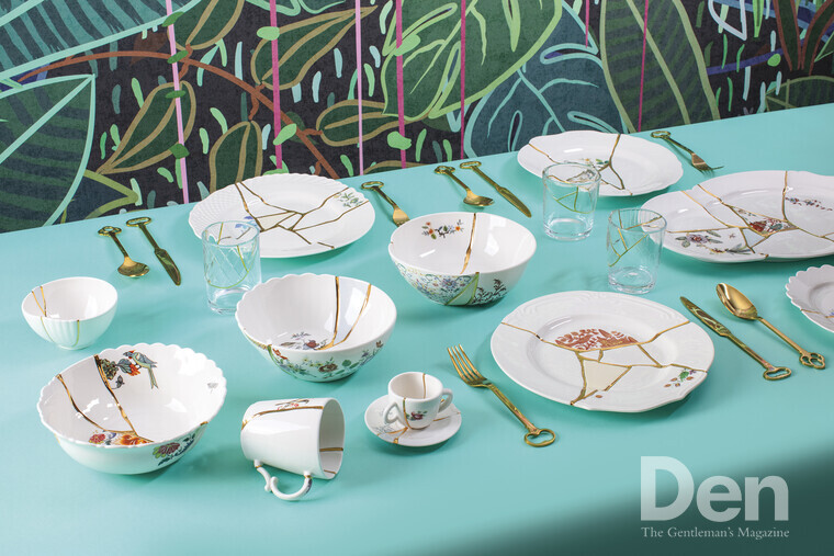이탈리아 라이프스타일 브랜드 셀레티(Seletti)는 디자이너 마르칸토니오와 협업해 킨츠기 컬렉션을 내놓았다. 흰색이 돋보이는 세련된 접시를 금가루로 이어 붙인 흔적이 선명하다. 단순히 킨츠기 기법을 연출한 것만이 아니라 조각과 선에 어울리는 그림을 새겨 넣어 더욱 고급스럽다. 일본에서는 귀한 손님에게 다과를 대접할 때 부러 킨츠기 찻잔이나 그릇을 냈다고 하는데, 셀레티의 감각적인 제품을 손님맞이에 활용하거나 선물하기에도 안성맞춤일 듯하다.