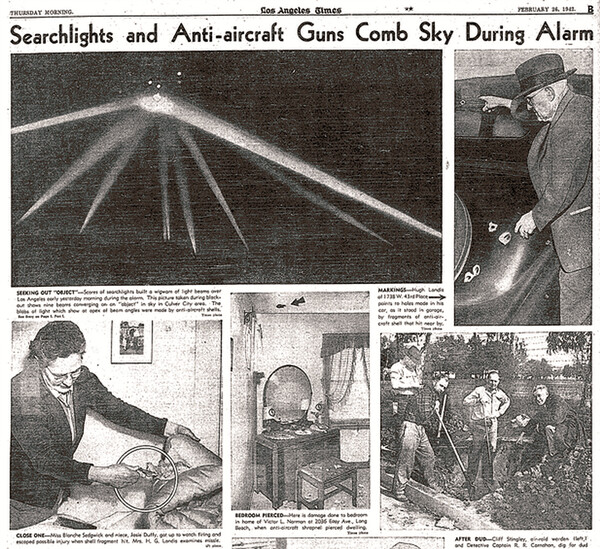 1942년 2월 24일 밤 LA 상공에 정체불명의 비행 물체들이 나타나 육군이 대공포 사격을 가했다. 진주만 공습을 받은 지 얼마 지나지 않은 때라 일본군의 공습으로 오인한 미군은 1시간 동안 1400여 발의 대공포를 발포했으나 비행체는 계속 제자리에 머물다가 순식간에 사라졌다. 이 내용은 다음 날 <LA타임스>에 대서특필됐다.