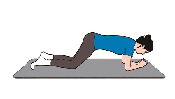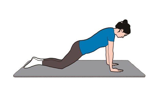 ➋ 양손을 20cm 정도 앞으로 이동한다. 엉덩이와 무릎을 들어 올려 팔굽혀펴기 자세를 만든 뒤 40초간 유지한다.