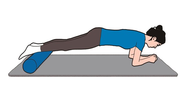➋ 그대로 팔꿈치를 바닥에 대면서 몸의 중심을 낮춘 다음, 곧바로 폼롤러 위의 양쪽 발목을 지지대 삼아 다리에 힘을 주면서 쭉 뻗어 바닥에서 하체 전체가 뜨게 한다. 복부에 힘을 주면서 무릎을 몸 쪽으로 당겨 폼롤러를 롤링한다.