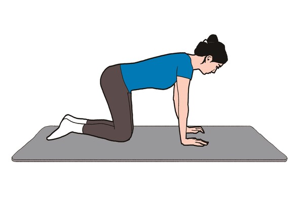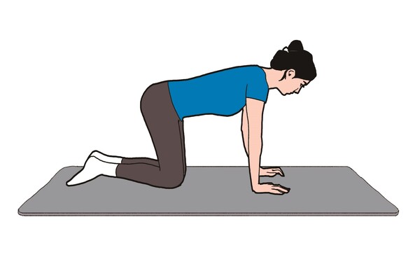 ➊ 무릎을 바닥에 대고 네 발 기기 자세로 엎드린다.