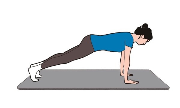 Tip 손목과 어깨가 일직선이 되어야 하며, 머리와 발도 일직선을 유지한다. 허리가 꺾이지 않도록 복부의 긴장감을 유지한다.