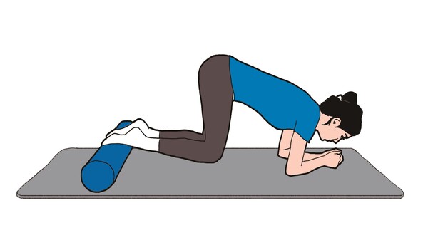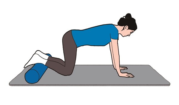 ➊ 무릎을 바닥에 대고 네 발 기기 자세로 엎드린 뒤 양발을 폼롤러 위에 올린다. 이때 양쪽 발목이 폼롤러 위에 닿게 한다.