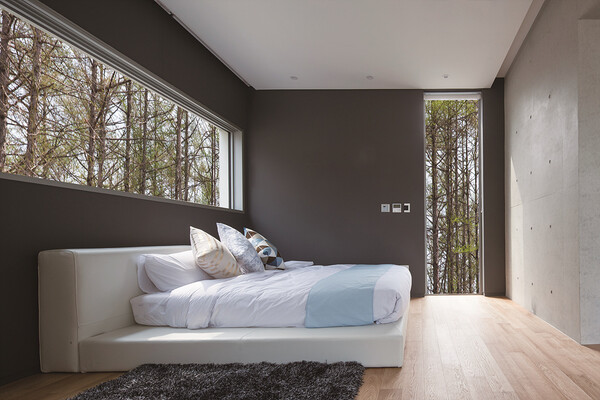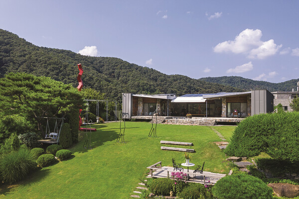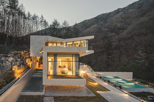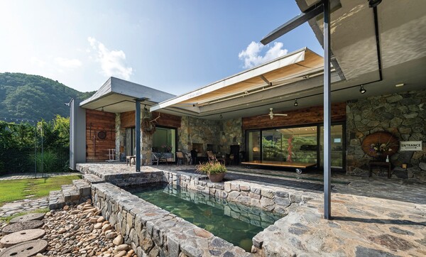 양평 서종면에 위치한 ‘까사누아’는 2013년 건축가 신규철이 지은 럭셔리 독채 펜션이다. 누구의 방해도 받지 않고 자연을 벗하며 온전한 휴식을 누리게 하려는 건축가의 마음을 그대로 구현한 이 펜션은 총면적 약 3967㎡(1200평)의 정원에 지어졌다. 산세와 계곡이 절묘하게 조화를 이뤄 시골집에 놀러온 듯 편안하다. 맞은편 계곡과 산을 향해 뻗어 있는 잔디 마당은 탁 트여 있어 머무는 사람에게 여유로움을 선사한다. 마당의 연못으로는 지붕을 통해 시원한 물줄기가 떨어져 그야말로 가슴까지 시원해진다.