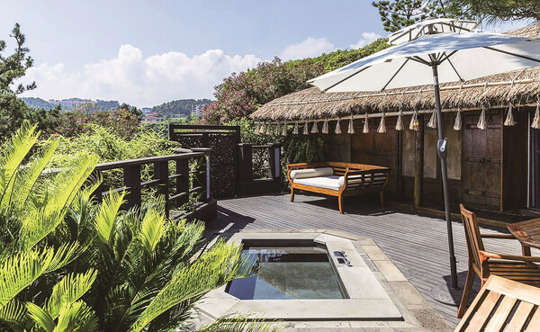 리조트 중앙에 펼쳐진 야외 풀과 이국적인 건물이 동남아의 럭셔리 리조트 같은 분위기를 풍긴다. 이엉을 얹은 초가지붕은 사실 동남아가 아니라 제주 전통 가옥을 모티브로 삼았다. 하지만 건물 주변의 야자수와 푸른 바다, 요트가 어우러져 해외 휴양지 느낌이 물씬 난다.
