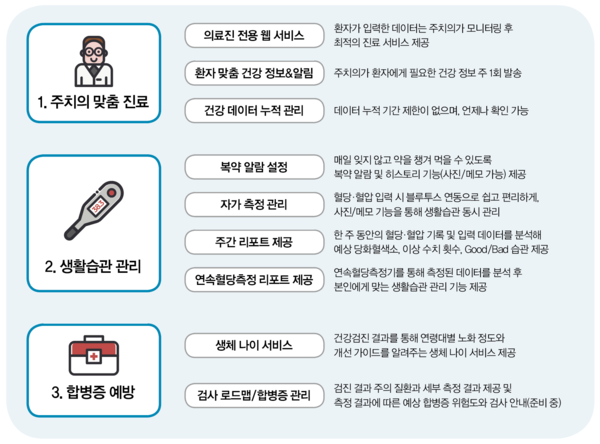환자 내원 시 의료진 웹 화면을 같이 보면서 현재 건강 상태에 대해 이야기한다. 실제 본인이 기록한 혈당·혈압 데이터가 정리되어 인포그래픽 형태로 보여지기에 환자도 자신의 상태를 한눈에 이해할 수 있다. 그리고 장기 처방시 이상 수치가 있는 환자는 모니터링 후 메시지를 보내거나 내원 안내를 통해 재교육하고 있다.