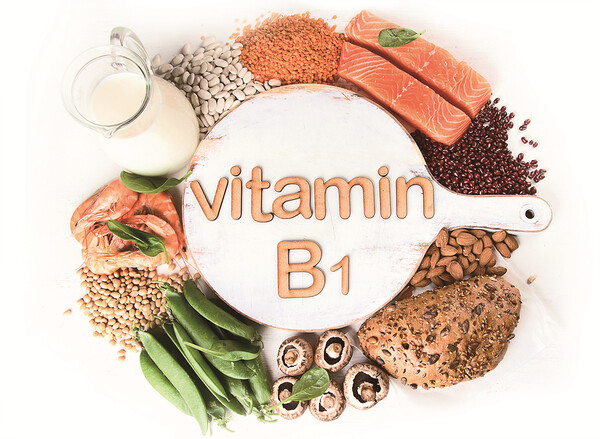 에너지대사 및 핵산 합성 조효소로 사용. 신경 작용 조절, 식욕 증진, 당질대사 등의 역할을 하고 소화액 분비를 촉진한다. 비타민 B1은 체내 배출이 빠르고, 반감기가 짧아 결핍증이 나타나기 쉽다. 부족할 경우 만성피로·식욕부진·권태감 등이 생기며, 심한 경우 각기병이나 베르니케-코르사코프증후군에 걸릴 수 있다.