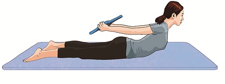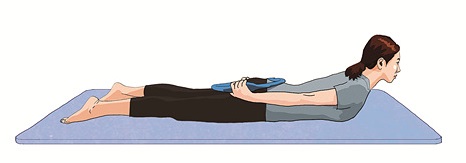 ➊ 바닥에 엎드린 뒤 양팔을 뒤로 뻗어 필라테스 서클을 두 손으로 잡는다.