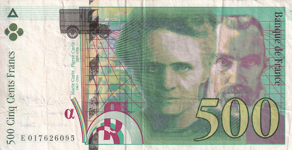 500프랑 지폐 속 인물 중 앞에 있는 사람은 ‘퀴리 부인’으로 불리는 과학자 마리 퀴리다. 그녀는 물리학자였던 남편 피에르 퀴리(500프랑 뒤에 있는 인물)와 함께 방사성 원소 ‘라듐’을 발견해 1903년 노벨물리학상을 수상했다. 이들 부부의 연구로 인류는 효과적으로 암을 치료할 수 있는 기반을 마련했다. 남편 피에르의 사망 후 마리는 혼자서 연구에 몰입해 1907년 라듐 원자량을 더욱 정밀하게 측정해냈고 금속 라듐을 분리하는 데도 성공, 1911년 노벨화학상을 수상했다. 하지만 인체에 유해한 라듐의 오랜 연구로 방사능에 많이 노출된 나머지 결국 백혈병과 악성 빈혈에 시달리다 사망한다.