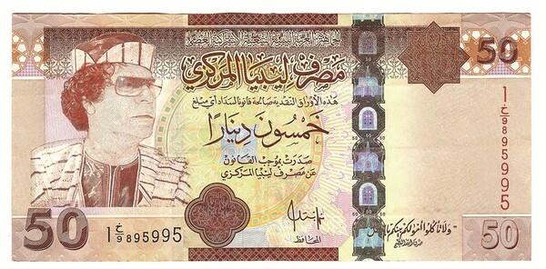 카다피는 2008년부터 자신의 얼굴이 들어간 50디나르 지폐를 발행했다. 42년간 집권한 독재자치고는 뒤늦게(?) 지폐에 손을 댄 셈. 이 화폐는 2013년까지 유통됐는데, 2011년 시민혁명으로 카다피가 처형당하고 난 후 ‘더 이상 카다피의 얼굴을 보고 싶지 않다’는 국민 여론을 수렴해 2013년부터 발행이 중지됐다. 집권 초기에는 리비아의 경제발전을 이끈 공로도 있었지만, 말년에는 “(시민혁명에 참가한)시위대는 ‘개’다”, “전시에는 모든 폭력 행위가 합법이다” 같은 망언을 쏟아내는 등 정신적으로 문제가 있었다.