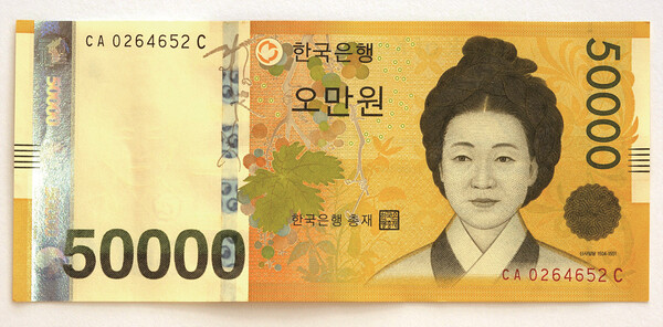 2009년 신사임당이 그려진 5만원권이 발행되면서 율곡 이이와 더불어 모자(母子)가 지폐 인물로 등극했다. 이는 세계적으로도 이례적인 일. 한국 지폐 역사상 두 번째 여성 모델이자 현재 유통되는 원화 중 유일한 여성 모델이다.