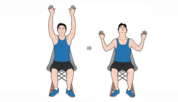 ➊ 의자에 허리를 곧게 펴고 앉아 서서히 양팔을 들어올려 만세 자세를 만든다.