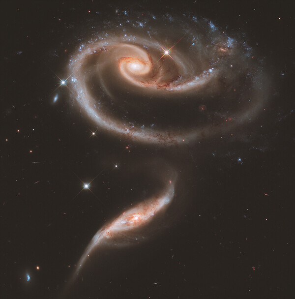 장미꽃처럼 아름다운 모습이지만, 사실은 두 은하가 처절한 사투를 벌이는 중이다. 위쪽에 있는 UGC 1810 은하가 10만 광년 떨어진 UGC 1813 이라는 막대 은하를 끌어당기는 모습으로 두 은하는 먼 훗날 충돌할 운명 이다. 우리 은하도 이처럼 안드로메다 은하와 서서히 가까워지고 있다.