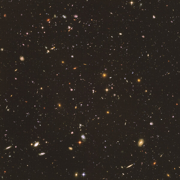 우주 가장 깊은 곳을 보려는 프로젝트인 ‘허블 울트라 딥 필드(HUDF)’의 결과물. 2003년부터 2014년까지 이뤄진 모든 관측을 종합한 결과다. 사진에 보이는 점은 몇 개를 제외하면 모두 저마다 수억 개 이상의 항성을 품고 있는 은하들이다.